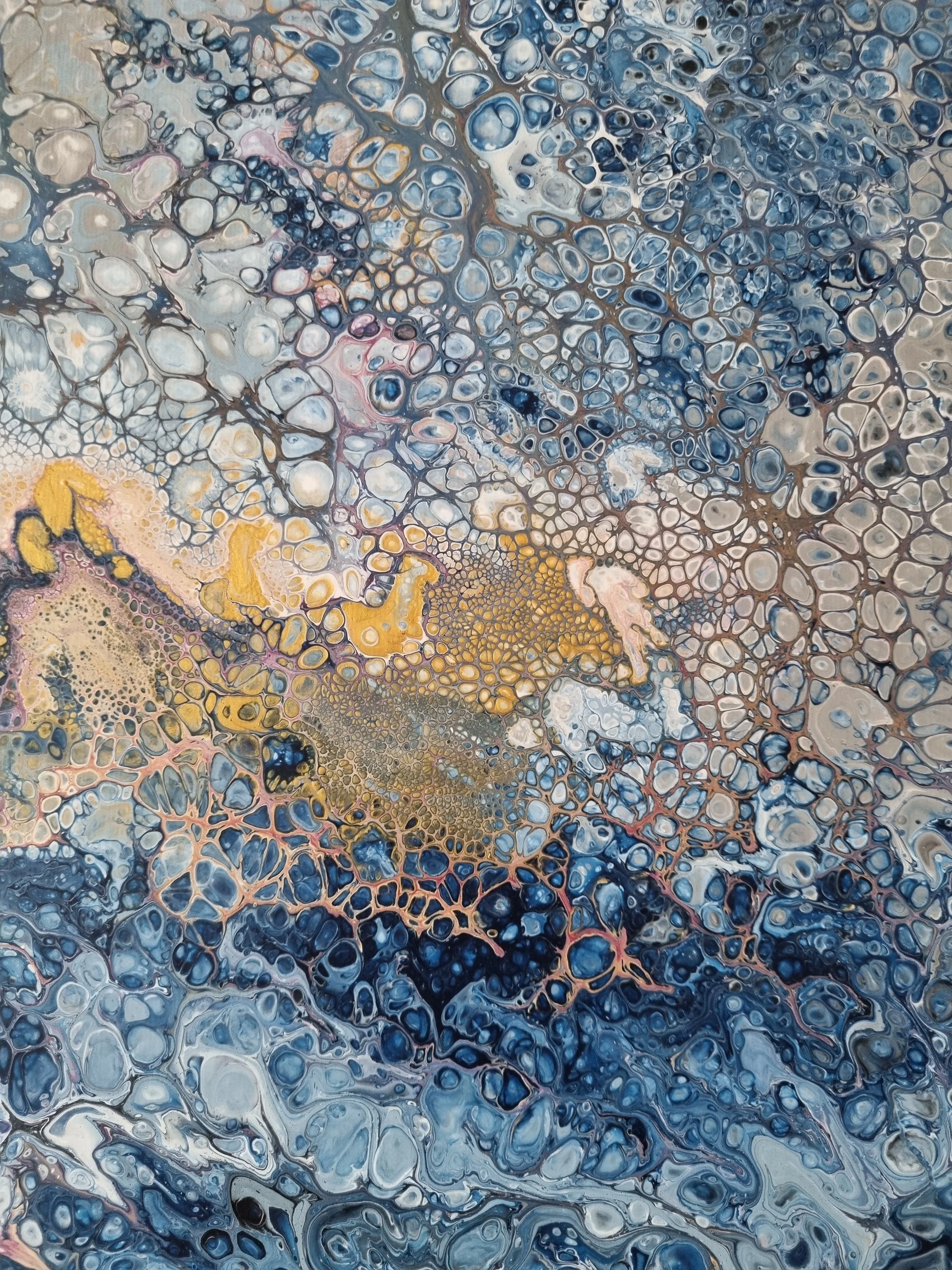 Rozměr tohoto plátna je 60x70 cm. Harmony je abstraktní obraz vyzařující rovnováhu a vnitřní klid. Jemné přechody modrých, zlatých a pastelových tónů se prolínají v plynulé kompozici.