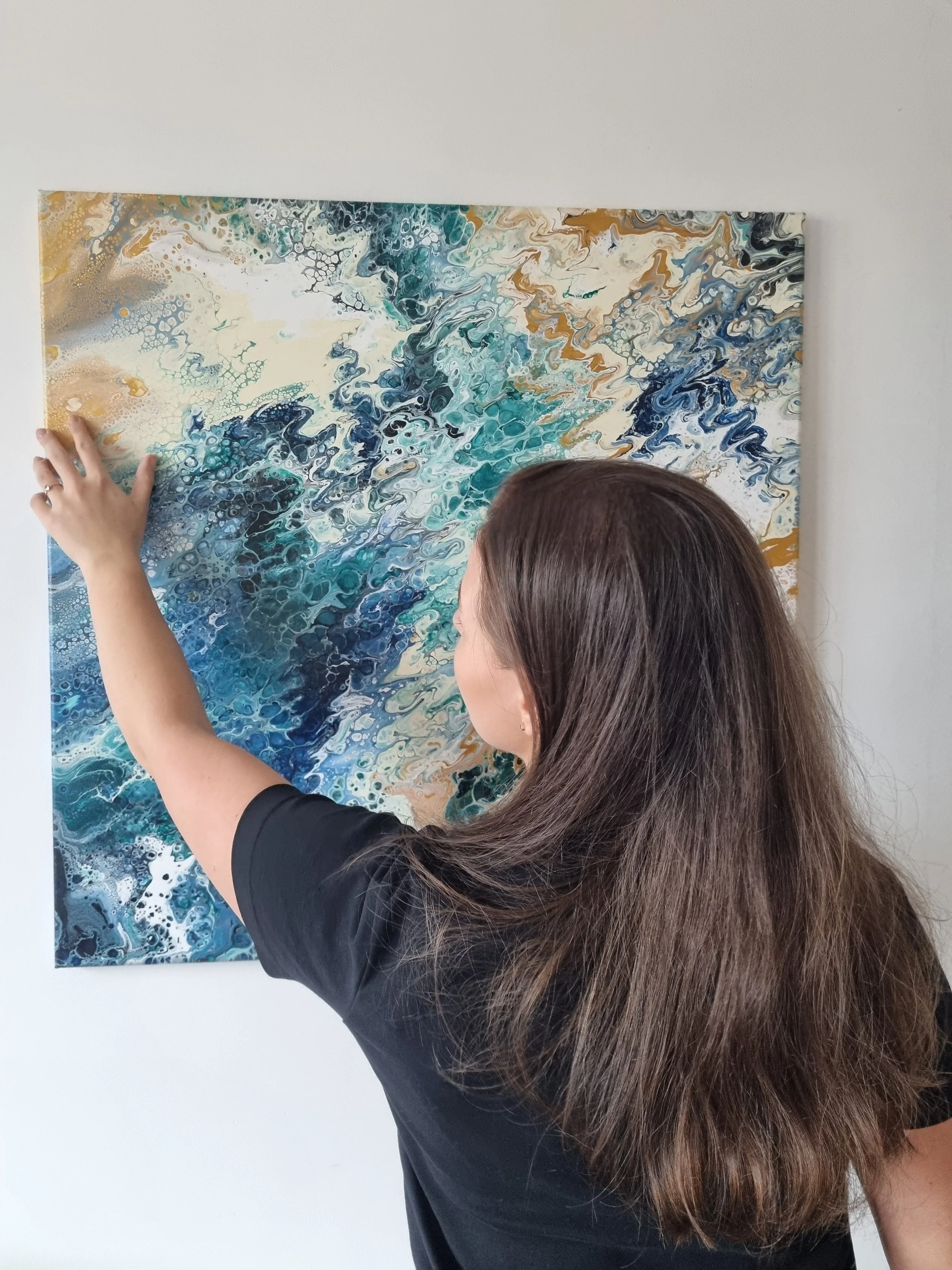 Rozměr tohoto plátna je 80x80 cm a celou jeho plochu pokrývá dynamická kompozice modro-zelených a zlatavých odstínů. Kompozice působí dojmem vířící energie či proudění vody, která se proplétá v jemných i kontrastních liniích. Obraz nese název Ókeanos podle starořeckého titána, jenž zosobňoval všeobjímající oceán obklopující celý svět. Tento název neodkazuje na konkrétní moře, ale na prapůvodní, nekonečný vodní princip, z něhož vše vzniká a do něhož se vše vrací. Obraz nese myšlenku nekonečnosti, jednoty a propojení všeho živého, kterou Ókeanos v řecké mytologii představuje.